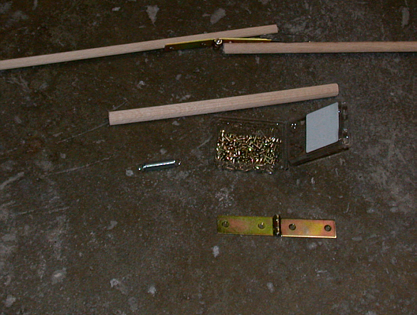 < Als nächstes brauchen wir den kurzen, dicken Holzstab (welcher den unteren Teil des Skeletts bilden soll), Schrauben, ein Scharnier und eine Feder. >
